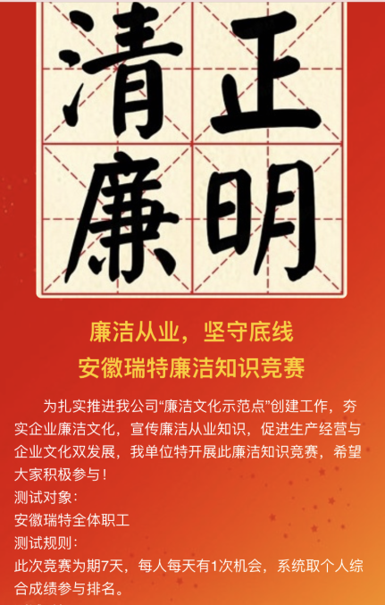 為扎實(shí)推進(jìn)安徽瑞特“廉潔文化示范點(diǎn)創(chuàng)建”工作,突出以人為本理念,全面推動(dòng)廉潔從業(yè)理念向一線延伸,安徽瑞特黨支部利用微信線上平臺(tái),組織開展了為期1周的廉政知識(shí)微信競(jìng)賽活動(dòng)。