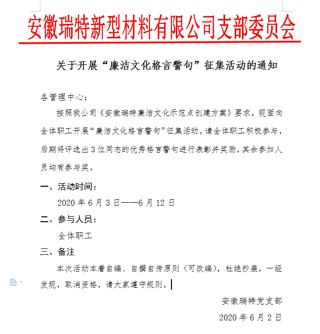為進一步規(guī)范生產(chǎn)經(jīng)營管理,強化廉潔意識,充分發(fā)揮企業(yè)文化在公司發(fā)展中的引領(lǐng)作用。安徽瑞特依據(jù)2020年度目標任務(wù),結(jié)合生產(chǎn)經(jīng)營特點,自今年4月中旬以來,扎實開展了 “廉潔文化示范點”創(chuàng)建工作。