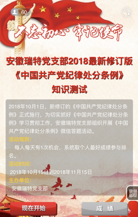 2018年10月1日,新修訂的《中國(guó)共產(chǎn)黨紀(jì)律處分條例》正式施行,為了切實(shí)抓好《中國(guó)共產(chǎn)黨紀(jì)律處分條例》學(xué)習(xí)貫徹工作,安徽瑞特黨支部組織開(kāi)展的《中國(guó)共產(chǎn)黨紀(jì)律處分條例》微信答題活動(dòng)于10月15日正式啟動(dòng)。