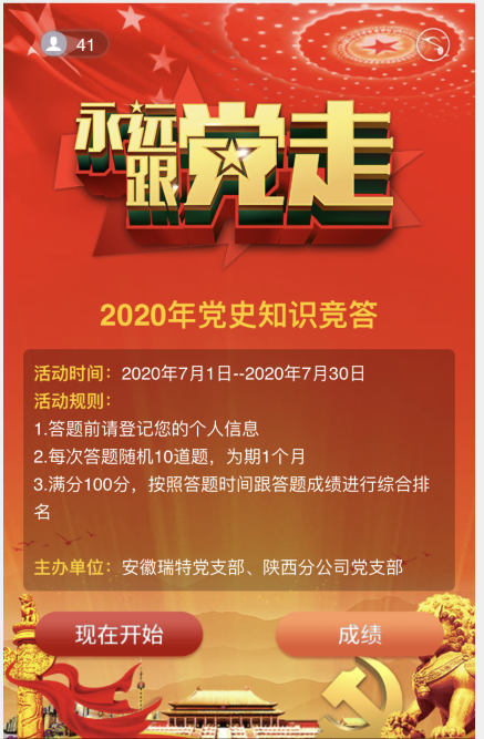 遙憶輝煌史詩,禮贊初心不渝--安徽瑞特黨支部聯(lián)合陜西分公司黨支部開展黨史知識(shí)微信競(jìng)答活動(dòng)