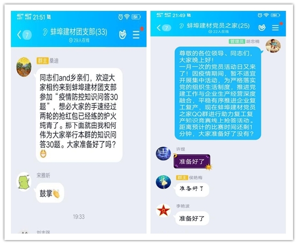 `活動于3月13日晚上7點(diǎn)30分,率先以小規(guī)模答題模式在蚌埠建材團(tuán)支部QQ群(33人)進(jìn)行;并于晚上8點(diǎn)整,同時在蚌埠建材黨員之家QQ群(25人)、蚌埠建材QQ群(107人)、BBJC生產(chǎn)合作伙伴QQ群(182人),進(jìn)行全面開花式線上搶答活動。
