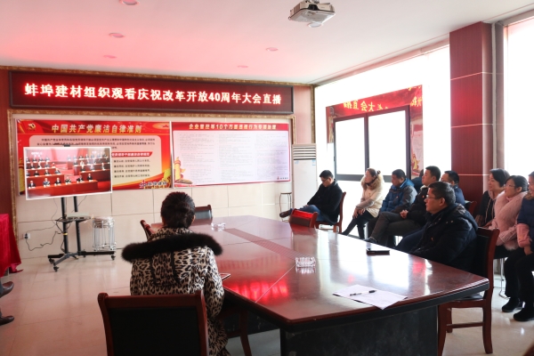 12月18日上午,蚌埠建材黨支部組織公司全體黨員、積極分子及遞交入黨申請書人員集中觀看了“慶祝改革開放40周年大會”直播,認(rèn)真聆聽習(xí)近平總書記重要講話,共同感受改革開放40年偉大成就的喜悅。