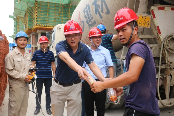 7月26日上午,陶良敬同志再次帶領(lǐng)“送清涼”小組來到十七冶產(chǎn)業(yè)園、安徽水利和順名都城等項目部,慰問在高溫下仍奮戰(zhàn)在施工現(xiàn)場的同事們,為他們送去防暑降溫的物品,送上清涼與關(guān)懷。