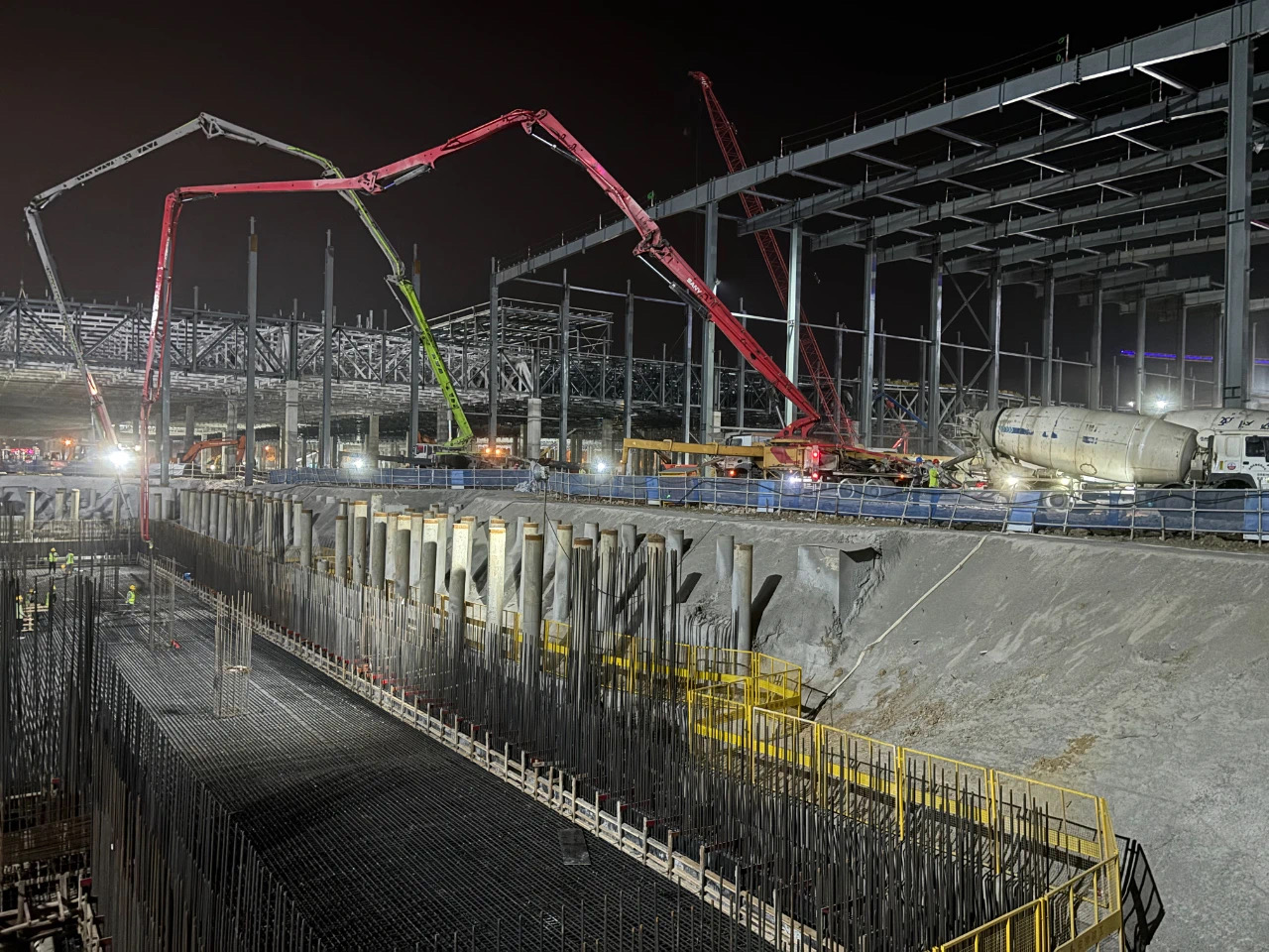 合肥大眾項目是集團(tuán)重點(diǎn)工程項目,也是智慧化建材科技園的生動實踐。建工建材在接到13000多方大體量混凝土澆筑任務(wù)后,高度重視,迅速行動,召開專題會議制定詳細(xì)的保供方案和應(yīng)急預(yù)案,組織安徽瑞特、擎工建材、新途建材三站協(xié)同,對物流進(jìn)行優(yōu)化舉措,強(qiáng)化調(diào)度,攪拌車和泵車在統(tǒng)一指揮下快速到位,140輛罐車,13臺泵車連續(xù)作業(yè)28小時,比預(yù)定計劃提前8小時完成澆筑任務(wù)。澆筑期間,參戰(zhàn)單位及工地現(xiàn)場施工人員各司其職,強(qiáng)化調(diào)度提升了車貨匹配效率,降低運(yùn)輸成本,節(jié)約運(yùn)輸時間,展示出更強(qiáng)大的保供能力,得到參建各方的一致好評,樹立了良好的品牌形象。